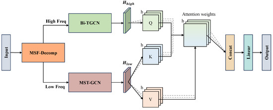 In multi-scale time series forecasting, various scale patterns play distinct roles in influencing prediction outcomes. To effectively merge feature representations from MST-GCN and Bi-TGCN, a multi-head cross-attention mechanism is employed instead of simpler methods such as concatenation or global pooling. This approach effectively integrates and balances high and low-frequency information from different scales for the final prediction. As depicted on the right side of Figure 2, MST-GCN processes the low-frequency component to produce , while Bi-TGCN processes the high-frequency component to generate . In this setup, the high-frequency features act as the query, with the low-frequency features forming the key-value set. Through the multi-head cross-attention mechanism, the final multi-scale fused feature representation is computed as follows: