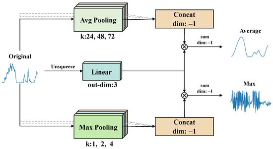 Based on the aforementioned method, we designed the MSF-Decomp module shown in Figure 3. This module uses average and max pooling to process data, where average pooling captures general trends, and max pooling highlights peaks or extreme values. It also incorporates various-sized pooling kernels, enhancing the separation of high-frequency and low-frequency components. Specifically, the module concatenates components from different-sized pooling operations. To maintain the original temporal data, it expands the data by one dimension, transforming it into a vector , with the last dimension being 3. Integration of various components is achieved through a weighted sum operation. For the input sequence , the expression is as follows:
