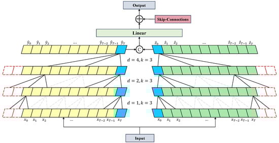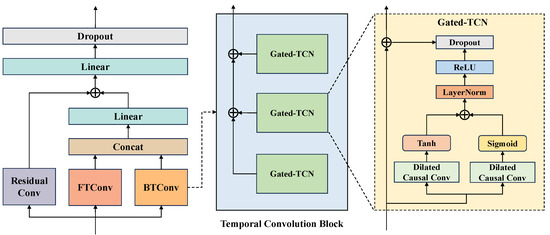 where b and c are bias terms for the different convolution kernels and , respectively; and control the speed of information flow and the proportion of information retained. The right side of Figure 5 displays the structure of the Temporal Convolution Block and Gated-TCN, where the Temporal Convolution Block consists of the outputs from three Gated-TCNs with different dilation factors added together.