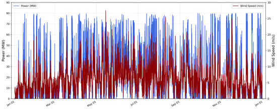 The dataset used in this study comes from the Chinese State Grid (CSG) [34], including actual power output and corresponding weather data for wind energy generation from 2019 to 2020. The dataset comprises over seventy thousand data points, with a time interval of 15 min. These data were collected via Supervisory Control and Data Acquisition (SCADA) systems and involved wind farms located in various terrains across North, Central, and Northwest China. A detailed description of all feature variables can be found in Table 1.