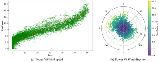 For the collected raw dataset, we first used linear interpolation to fill in missing values, then applied box plot methods to identify and analyze outliers. The trends in wind power generation and the fluctuations in wind speed at hub height in wind farm site 1 for the year 2019 are respectively shown in Figure 7. These trends indicate that the power series is influenced by various environmental factors, displaying non-stationarity and high volatility, while the wind speed is higher in the summer and lower in the winter, demonstrating clear seasonal variations. Figure 8a illustrates the close relationship between wind speed and power output, showing that once the wind speed reaches a certain critical point, the power output no longer increases, which is associated with the turbine’s rated power and cut-out wind speed. Additionally, Figure 8b reveals significant differences in wind speeds from different directions. When the angle difference between the wind direction and the turbine orientation is minimized, the turbine’s rotational speed significantly increases, thereby effectively enhancing the efficiency of wind power output.