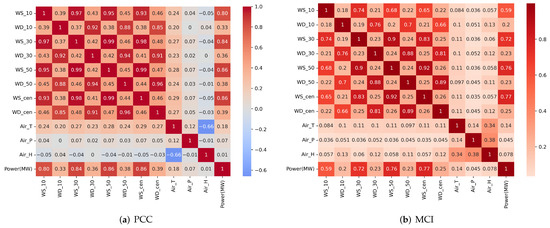 To further reveal the dependencies between power output and various variables, we evaluate these relationships using Pearson correlation coefficients (PCC) and Maximum Information Coefficients (MIC). The mathematical formulas are as follows: