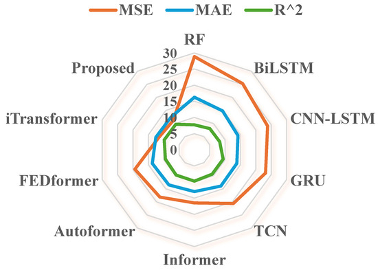 We plotted the indicator radar charts by equal scaling in Figure 10, which clearly demonstrates the outstanding performance of the proposed model on the metrics. The results of the first category of experiments show that in the context of short-term wind power prediction, RF performed the worst in terms of MSE and MAE, with scores 61.07% and 60.70% higher, respectively, than those of the proposed model, due to its limited capability to handle highly volatile time series. Although the other four models featured improvements in feature extraction, they failed to fully capture the impact of wind speed at different scales on wind power output. In the second category of experiments, the performance was generally far superior to that of the common baseline models used in the first category. Notably, the performance of Autoformer and FEDformer was significantly worse than their performance on general datasets, mainly because their full-sequence self-attention mechanisms overly focus on internal dependencies of variables, leading to high computational costs and excessive sensitivity to local noise. This makes them poorly suited to the high volatility of wind power data. The iTransformer showed performance similar to the proposed model, but the proposed model, by integrating MST-GCN and Bi-TGCN, optimized the capture of dependencies both between and within variables, making it more effective in handling real wind power data.