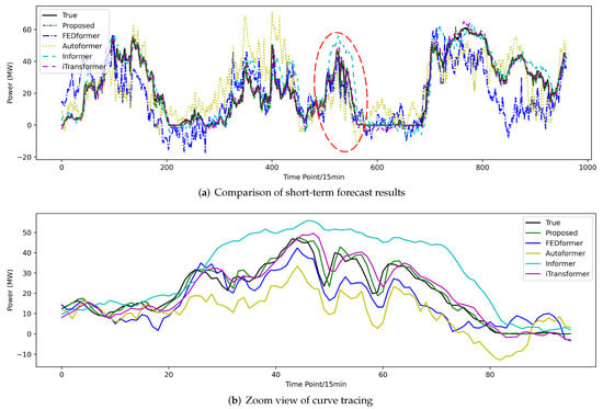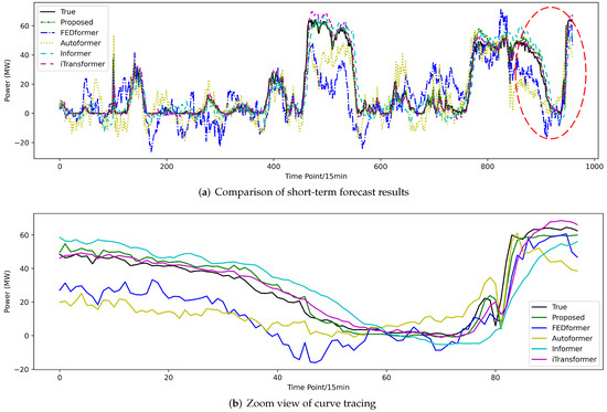 The error of all prediction methods increases with the number of forecasting steps, reflecting the challenges of mid-to-long-term forecasting. We chose a second category baseline model with better performance for comparative experiments. The mid-to-long-term prediction results are displayed in Table 8. The results show that although the proposed model’s MSE and MAE reached 47.752 and 4.265 for mid-term forecasting and 89.818 and 5.847 for long-term forecasting, it still performed better than the comparison models. The iTransformer showed similar metrics to those of the proposed model in short-term forecasts but had significantly higher errors in mid-to-long-term forecasts. In summary, the proposed model demonstrates significant competitive advantages in the mid-to-long-term wind power forecasting domain, providing a precise and reliable forecasting tool for wind farm management and grid scheduling.