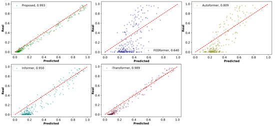 The results of Table 7 clearly demonstrate the significant advantages of the proposed model in adapting to seasonal changes, especially in the transitional seasons of Spring and Autumn. In these seasons, the proposed model recorded the lowest MSE and MAE values at 12.563 and 2.547 for Spring, and 11.564 and 2.45 for Autumn, respectively. These performance metrics were slightly better than those of the iTransformer model and significantly surpassed other baseline models. Moving into Summer, as the climate and wind patterns become relatively stable, all models generally showed improved performance. The iTransformer’s capability to learn nonlinear representations for each variable individually allowed it to exhibit higher predictive efficiency and accuracy in the relatively stable summer, slightly leading the proposed model with lower MSE and MAE values by 0.204 and 0.08, respectively. As for Winter, characterized by high wind speeds and variable wind directions, which increase prediction difficulties, all models saw a rise in errors. However, the proposed model still demonstrated superior performance, with MSE and MAE values of 14.115 and 2.842, respectively, and an value close to 1, indicating that its predictions closely matched the actual wind power outputs, showcasing its exceptional robustness and adaptability.