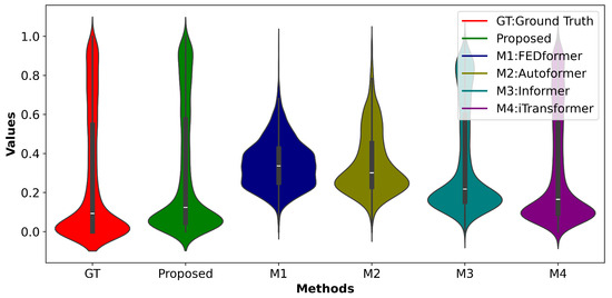 In the analysis for Case 2, we selected the five best-performing models for visualization. Figure 13 clearly shows that the proposed model continues to maintain the best performance, which demonstrates its strong fitting capabilities. We plotted violin plots in Figure 14 to compare the probability densities and distributions of the predicted values against the actual values across different models. In Figure 14, the central part is a boxplot, with the white dot representing the median. The violin plot and kernel density plot of the proposed model more closely match the actual data distribution, exhibiting the least volatility and the best stability, further validating the high robustness of the proposed model.