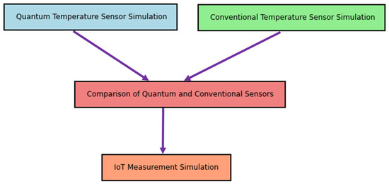 This figure illustrates a flowchart outlining the methodology used to compare the performance of quantum and conventional temperature sensors, as well as their integration into an IoT system. Each key step in the simulation process is represented by a colored rectangular box, making the flow easy to follow.