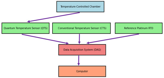 The figure illustrates the experimental setup used to compare the performance of two types of temperature sensors: a quantum temperature sensor (QTS) and a conventional temperature sensor (CTS). The objective of this experiment is to evaluate the accuracy and sensitivity of each sensor in a controlled environment. The image presents several key pieces of equipment arranged in rectangular boxes, with labels indicating their respective roles. The “Temperature-Controlled Chamber” is positioned at the top, representing the environment where the measurements are taken. The sensors—QTS, CTS, and a reference Platinum Resistance Temperature Detector (RTD)—are placed at critical points in the experiment. Each of these sensors is connected to the “Data Acquisition System” (DAQ), which centralizes the measurements before transmitting them to a computer for processing and analysis. Arrows connect the different components, illustrating the flow of data collected throughout the system.