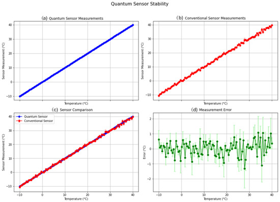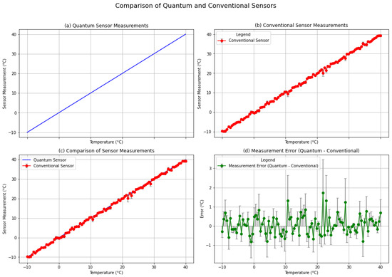 In our study, which compares the performance of quantum temperature sensors (QTSs) with conventional sensors (CSs) across a temperature range of −10 to 40 °C, we now include specifics about the simulation process. For quantum sensors, we used a resolution of 0.01 °C and a noise model based on environmental variability and sensor calibration data.