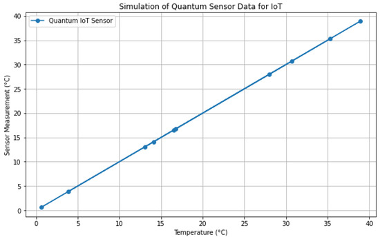 Figure 5 presents data collected by a simulated quantum IoT sensor over time. The x-axis represents the actual temperature in degrees Celsius, and the y-axis shows the sensor measurement. The plot demonstrates the performance of the quantum sensor in a real-time data collection scenario.