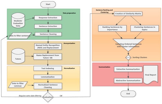 Figure 1 shows the proposed model for analyzing responses to the open-ended questions. The model outlines a workflow consisting of five distinct steps. In each step, one or more processes are executed, with the results feeding into the subsequent steps. The first three steps (data preparation, anonymization, and normalization) focus on pre-processing, while the next two (sentence ranking and clustering, and summarization) involve mechanisms for extractive and abstractive summarization. The first group of steps can be performed iteratively until the results reach a satisfactory level of quality.