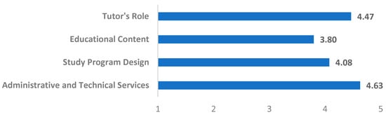 In the aforementioned context, students are invited to anonymously evaluate their experience of the modules they attended to through an online questionnaire, which includes four evaluation strands comprising criteria adopted after an extensive literature review on student satisfaction in academic distance education and e-learning settings: (a) the role of the tutor (evaluation criteria: clarity in resolving queries, assistance in understanding educational material, guidance in completing educational activities, constructive written feedback, communication initiatives during the academic year/semester, encouragement during studies, and utilization of the educational platform), (b) the educational content, i.e., educational material and activities (evaluation criteria: material alignment with learning outcomes, material’s contribution to understanding the subject matter, material’s contribution to completing educational activities, and contribution of activities to learning outcomes), (c) the module design (evaluation criteria: clarity of module objectives, feasibility of the study schedule, clarity of assessment and grading criteria, and contribution of tutor–student meetings in subject-matter comprehension), and (d) the administrative and technical services (evaluation criteria: satisfaction with student registry support, satisfaction with technical support (helpdesk), usability of the educational platforms, and usability of the HOU website). These have been formulated in 20 closed-ended questions. In addition, the questionnaire includes three open-ended questions that encourage students to articulate the most important positive and negative aspects of the module, as well as propose suggestions for improvements. These questions aim to gather additional information about students’ learning experiences, which the closed-ended structure of the questionnaire may not anticipate.