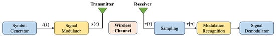 The entire signal model. At the transmitter, the symbol sequence is modulated into a specific scheme and transmitted through a transmitting antenna. After channel propagation, the transmitted signal eventually reaches the receiving antenna. At the receiver, the discrete signal is identified by the modulation recognition module to determine the modulation type, and then demodulated to retrieve the original information.