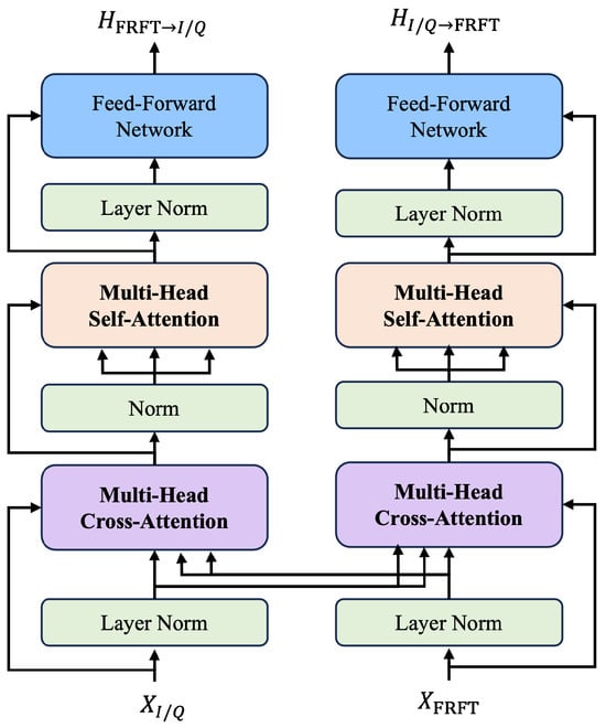 Multimodal fusion is the key for MAMR. Existing fusion methods include but are not limited to concatenation-based [], tensor-based [], CNN-based [], and attention-based [,,] approaches. For example, [] proposed a dual-stream Transformer network, integrating both time-domain and spatial-domain I/Q features, demonstrating the effectiveness of multimodal features. Recently, methods based on cross-modal fusion have been gaining popularity [,]. Cross-modal attention enhances the target modality by learning directional pairwise attention between different elements. However, employing pairwise cross-modal attention to fuse multimodal sequences is inefficient, with computational complexity depending on the length of single modality features, often exhibiting quadratic complexity. For instance, directly enhancing the FT modality with the entire I/Q modality sequence may introduce redundant information. Therefore, achieving a balance between the model’s efficiency and performance is crucial for MAMR. Furthermore, different modal representations exhibit varying levels of information intensity, leading to noise when directly fusing the information of different densities at the same layer. For instance, the signal intensity of shallow feature representations is low level, while that of deep features is high level. It is more comprehensive to fuse complementary information between high-level features. Moreover, the information from different modalities is asynchronous, and learning aligned correlated features facilitates aggregating inter-modal information, maximizing the exchange of information.