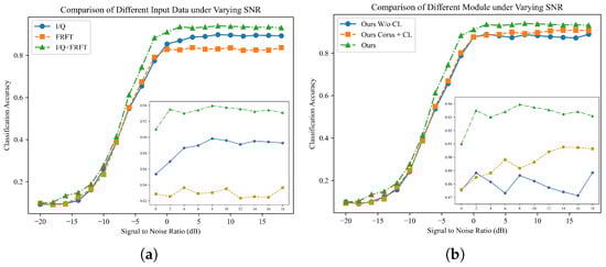 To validate the effectiveness of multimodal features, we conduct separate experiments on single-modalities of I/Q and FRFT. As shown in Figure 5a, multimodal features outperform unimodal features overall. In the [0 dB–18 dB] range, the “I/Q + FRFT” multimodal performance exceeds that of unimodal features by 3% in accuracy. At higher signal-to-noise ratio levels, FRFT performs less effectively than I/Q overall. However, at lower signal-to-noise ratio levels, their performance is comparable. Nevertheless, multimodal features enhance unimodal performance to some extent, further capturing the complementary features of both, enhancing modulation recognition capabilities. At 0 dB, compared to I/Q and FRFT, respectively, there is a 6% and 7% improvement in accuracy.