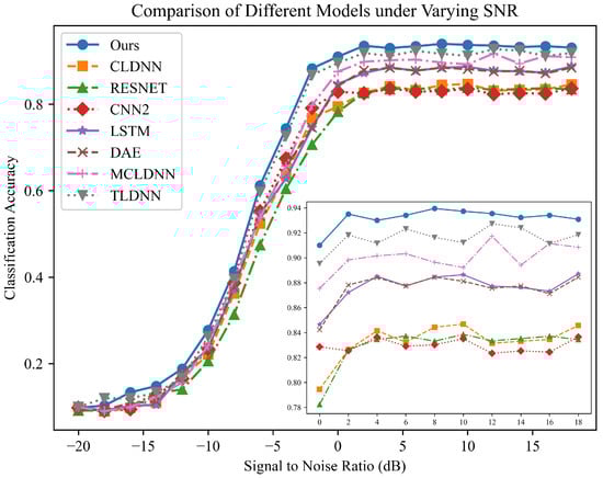 To evaluate the performance of our proposed method (AbFTNet), we compare it against other deep learning-based AMR methods. These methods include CLDNN, RESNET, CNN2, LSTM, DAE, MCLDNN, and TLDNN, among others. As shown in Figure 6, the AbFTNet model outperforms existing state-of-the-art (SOTA) methods across all signal-to-noise ratio (SNR) levels on the Radio2016.10a dataset, achieving the highest average accuracy of 64.59% (+1.76%). In particular, AbFTNet exhibits significant performance in the mid-to-low SNR range, showing similar performance to TLDNN and notably surpassing other methods. AbFTNet achieves an accuracy of 59.6% at −6 dB, representing low-SNR conditions. In high-SNR scenarios, AbFTNet achieves the highest accuracy of 93.8% at 12 dB, while TLDNN reaches a maximum accuracy of 92.3%. This indicates that AbFTNet possesses a unique advantage in handling noise, demonstrating outstanding performance in low-SNR environments while maintaining generalizability across all noise environments. We analyze that, on one hand, compared to other methods, AbFTNet employs an alignment-first, fusion-later approach, which imposes an information entropy constraint on the features, maximizing the complementary information in multimodal fusion. On the other hand, since signals are often redundant, AbFTNet uses a more efficient fusion scheme, avoiding the impact of noise at low signal-to-noise ratios.