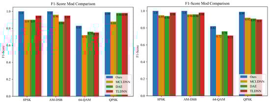 The F1 score is a metric for classification tasks that accurately evaluates the performance of the current model. Therefore, we compare the proposed method with other methods on the RML2016.10a dataset for 8PSK, AM-DSB, 64-QAM, and QPSK modulation schemes at 0 dB and 10 dB. Specifically, as shown in Figure 7, it can be seen that our method reaches a comparable level on these four modulation schemes, with improvements observed. Compared to TLDNN, our method shows the most significant improvements on these four modulation schemes, with increases of 5%, 5%, 8%, and 1% at 0 dB, respectively. It is worth noting that our method achieves a 100% F1 score for 8PSK and AM-DSB modulation schemes at both 0 dB and 10 dB, demonstrating outstanding performance.