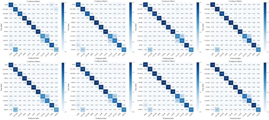 The confusion matrix serves as a standard format for evaluating accuracy, providing further insight into the accuracy across different categories. Therefore, we compare our proposed method with other models on the RML2016.10a dataset, focusing on the confusion matrices for different modulation classes at the 0 dB and 10 dB SNR levels. The results are shown in Figure 8. In the 0 dB range, our method consistently outperforms MCLDNN. Particularly, significant accuracy improvements of nearly 14% are observed for the 16-QAM and 64-QAM modulation classes. In the 10 dB range, in addition to similar results to those at 0 dB, we achieve 100% accuracy in many modulation classes. This further demonstrates the robustness and effectiveness of the multimodal approach in feature representation and fusion.