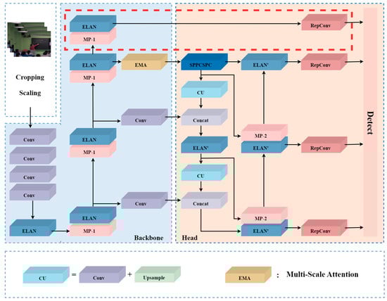 The attention mechanism plays a crucial role in computer vision by emulating how attention is allocated in the human visual system. It enhances the model’s recognition performance by dynamically allocating resources to identify key features and regions and focusing on processing information pertinent to the task. The classroom environment is relatively complex and can be influenced by variations in lighting and brightness, with individual teacher behaviors showing some similarities. To extract more localized feature information for effective recognition of teaching behaviors, this study integrated the efficient multiscale attention (EMA) [] mechanism into the YOLOv7 model. The attention mechanism aims to focus the model on specific regions of the image rather than the entire image. Given that the backbone network is crucial for feature extraction, progressively abstracting features from basic attributes such as edges and textures to more complex semantic elements like object components and whole objects, we integrated the EMA attention mechanism into the final layer of the original backbone network. This is illustrated in Figure 1.