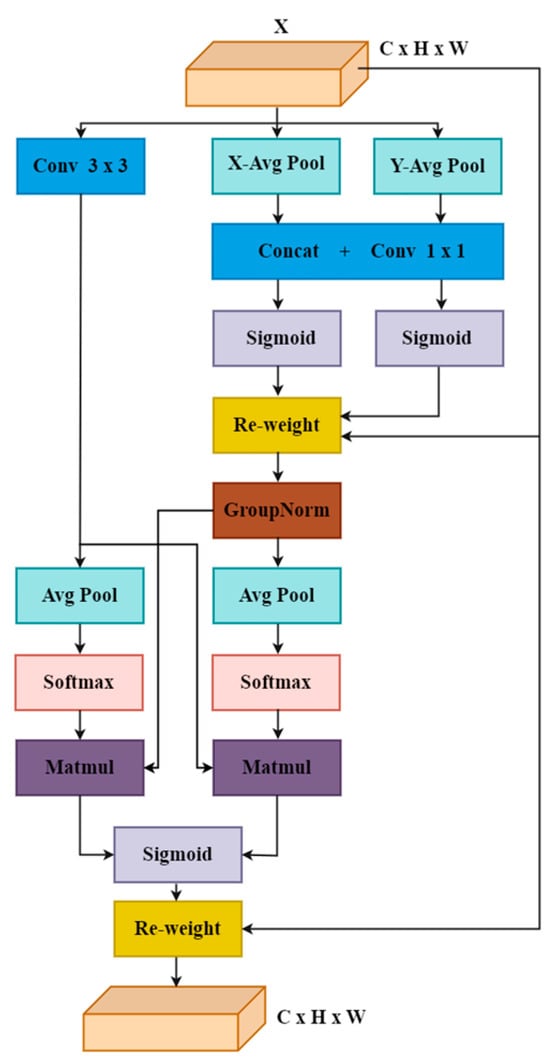 EMA is an innovative multiscale attention module that performs without dimensionality reduction, aimed at minimizing computational overhead while retaining per-channel information. This module adjusts specific channels to align with batch dimensions and organizes channel dimensions into several parallel sub-branches. As illustrated in Figure 2, the EMA configuration includes two parallel branches of 1 × 1 convolution and one branch of 3 × 3 convolution. For a given input feature , EMA divides it into G sub-features in the direction of the channel dimension for learning different semantic information, denoted by , (G<<C). In the 1 × 1 branch, channels are encoded along two spatial directions separately using global average pooling operations, and two-channel attention maps are aggregated using simple multiplication for cross-channel feature interactions. The parallel branching module aids in capturing cross-dimensional connections and establishing multi-dimensional relationships, while the 3 x 3 branch expands the feature space by capturing local cross-channel feature interactions and encoding inter-channel information while maintaining spatial structure information. To achieve richer feature aggregation, methods for aggregating cross-space information in various spatial dimensions are employed. The processing results of the above branches are used as the input tensor to handle the global spatial data using global average pooling, and the output is multiplied with the matrix dot product operation to produce the spatial attention map. The global pooling operation is as follows: