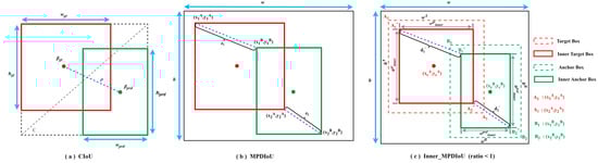 MPDIoU addresses the limitations of the existing loss function and introduces the consideration of non-overlapping regions by calculating the Euclidean distances between the upper-left and lower-right corners of the true and predicted boxes, which improves the model’s recognition performance. Nevertheless, this method does not consider the constraints of the IoU loss metric itself in favor of increasing the convergence by introducing a new loss term. Herein, we introduced a bounding box scaling factor (ratio) based on MPDIoU concerning the Inner_IoU [] idea and generated auxiliary bounding boxes with varying scales under the control of the scaling factor, which speeds up the regression results without adding any new constraints. When computing the loss for high IoU samples, it is faster to use a smaller auxiliary bounding box; for low IoU samples, a larger auxiliary bounding box works well. As shown in Figure 3c (where the ratio takes a value of <1), the dashed boxes are the original true and predicted box sizes, and the solid boxes are the scaled true and predicted box sizes. The specific scaling equations are shown below: