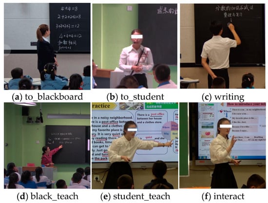 For image preprocessing, we intercepted pictures from the video at every 30th frame. Incomplete or ambiguous behavioral actions were filtered after cropping, filtering, and scaling to ensure the quality of the dataset. Finally, the LabelImg annotation tool was used to create data labels to construct the classroom behavior dataset. Referring to the behavior recognition literature and considering the requirements of real classroom scenarios, as depicted in Figure 4, we classified teacher classroom behaviors into the following six categories: facing the board (to_blackboard, tb), facing the students (to_student, ts), writing on the board (writing, w), teaching while facing the board (black_teach, bt), teaching while facing the students (student_teach, st), and interactive (interact, i). Due to occlusion, most images primarily contained the teacher’s upper body information. Aligned with the demands of teacher behavior analysis, we focused on labeling the upper body features of the teacher.