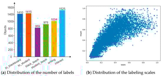 Due to certain similarities between the consecutively intercepted images, we screened and de-duplicated them, resulting in 6660 images, divided in a ratio of 8:2. The training set and validation set contained 5328 and 1332 images, respectively. To facilitate training and convergence of the model, the filtered images were uniformly cropped and scaled to the model’s default size of 640 × 640. We utilized the LabelImg tool to manually mark the targets in the images. The number of labels for the six behaviors is shown in Figure 5a, and the distribution of the target object labeling box scales is shown in Figure 5b. The MSCOCO dataset was classified into large, medium, and small targets according to the object scales: small targets (32 × 32 < area, s), medium targets (32 × 32 ≤ area ≤ 96 × 96, m), and large targets (96 × 96 ≤ area, l). Relying on the image dimensions of 640 × 640 and the target ratio in Figure 5b, it is known that large target objects are prevalent in this experimental dataset.