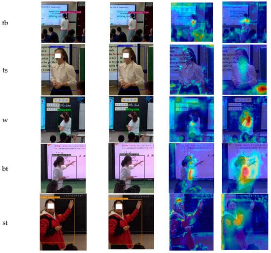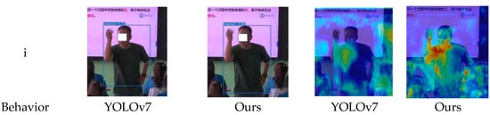 In this paper, the original YOLOv7 was compared with the improved method for recognition, and the recognition effect on six teacher classroom behaviors is shown in Figure 6; although the original model accurately recognized the behavioral categories in the images, our method demonstrated a higher level of confidence. The heat map in Figure 6 shows that the improved method in this study has greater and more focused attention on the target object when recognizing the teacher, verifying the method’s comprehensive capacity. The improved method in this paper can effectively identify multiple categories of teaching behaviors in classroom scenarios and measure variability among teachers by determining the frequency and percentage of each teaching behavior within a specified time period. This method lays the groundwork for classroom behavioral analysis and supports the assessment of teaching quality.