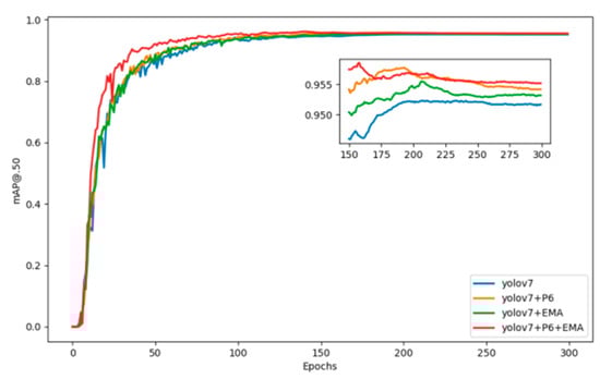 To evaluate the performance of the model after the improvement, we compared and analyzed the network model before and after the improvement and introduced the large target detection layer(P6), EMA, and Inner_MPDIoU into YOLOv7 for the ablation experiments, respectively. The experimental results of the model on the self-built dataset TCBDS are shown in Table 4.