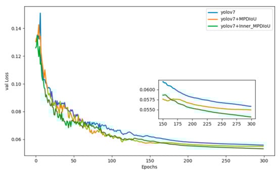 As shown in Table 4, all of the modules in this study had some enhancement effect and the improved model finally achieved 96.2% recognition accuracy on the mAP@.50 metric, improving mAP@.50 by 1.1%, mAP@.50:.95 by 2%, and R by 2.3% compared to the baseline model. The changes to the model on the mAP@.50 metrics after adding the large target detection layer and the EMA attention module, respectively are shown in Figure 6. When using the P6 layer and EMA alone, the recognition accuracy surpassed the initial YOLOv7 model, and the improvement of the P6 layer was better. This proves that the design of the large target detection layer can improve the checking rate and accuracy of the teacher’s behavior identification in classroom environments, while the integration of this paper’s method had the highest metrics curve and the best accuracy. In addition, the variation of loss values of the MPDIoU loss function and Inner_MPDIoU on the validation set is shown in Figure 7 and Figure 8, where the MPDIoU loss function converged faster with lower loss values, which sped up the convergence of the model after the introduction of the scaling factor. The Inner_MPDIoU loss curve was the lowest after about 165 rounds and by a continuous downward trend, a lower loss rate was realized, demonstrating the performance of the method in this study.