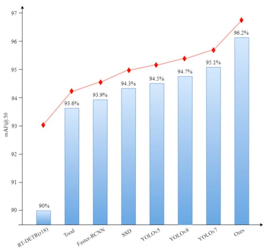 To further validate the efficiency of this paper’s method, we compared the improved method with the current mainstream target detection methods, which were uniformly evaluated using the self-built dataset TCBDS. The comparison results of the models on mAP@.50 are shown in Figure 9 and the precision of this paper’s method reached 96.2%, achieving the best results. This was 1.9% higher compared to SSD, a single-stage target detection algorithm, and 2.3% higher compared to Faster-RCNN, a representative of two-stage target detection algorithms.