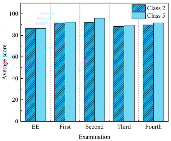 In order to explore the impact of instructional behaviors on student achievement, we analyzed an example of a senior math classroom video and grade information. In this paper, the results of the entrance exam and four monthly exams of senior 2 and senior 5 classes were collected and the details of the results of the two classes are shown in Table 6 and Figure 10. In addition, the teaching behaviors of these two classes in the mathematics classroom during the semester were identified and analyzed through sampling and the percentage of their student-oriented teaching behaviors were 48.8% and 57.5%, respectively. A comparison of the data in Table 6 and Figure 10 shows that the math scores of the two classes at entry were almost equal, but the scores of Class 5 were generally higher and grew faster due to a higher percentage of student-oriented teaching behaviors by Class 5 teachers. This shows that when teachers teach more student-oriented instruction it creates opportunities for interaction and communication, which will help improve student achievement.