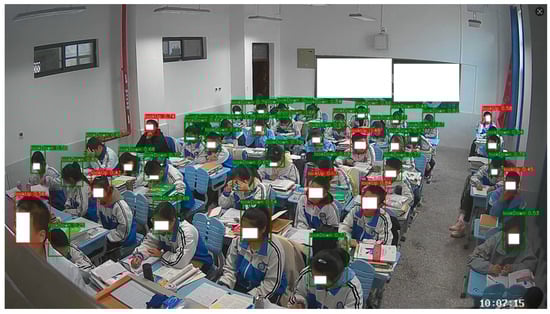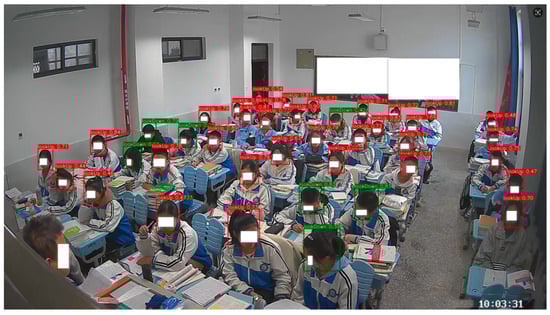 In order to study the impact of teaching behaviors on student engagement in the classroom, this paper takes a mathematics classroom in a high school class as an example to explore student engagement when different teaching behaviors occur. We reflected students’ classroom engagement through their head-up rate, where the red box detected students’ head-up behavior (lookUp) and the green box detected students’ head-down behavior (lookDown). As shown in Figure 11, when the teacher (bottom left) teaches facing the board, only a small number of students look at the board, and classroom heads-up rates are low. However, when the teacher teaches facing the students, as shown in Figure 12, the classroom head-up rate is generally higher and student-facing instructional behaviors contribute to increased student engagement in the classroom. Thus, teachers’ instructional behaviors have a direct impact on student engagement in the classroom and student engagement is higher when teachers have a higher percentage of student-oriented instructional behaviors.