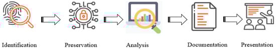 The digital forensic process entails five steps: identification, preservation, analysis, documentation, and presentation [13], as shown in Figure 1.