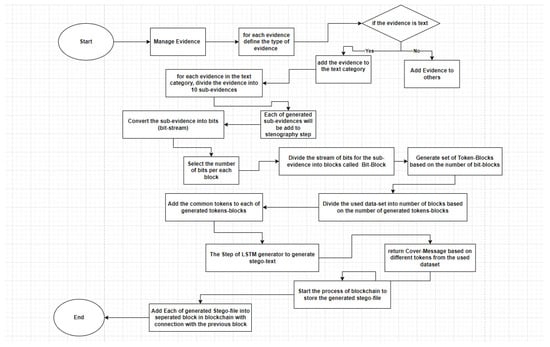 Following this preprocessing, the next phase begins. In this phase, each piece of evidence is divided into a set of ten chunks equal to 10. This threshold was selected based on a balance between security and manageability. Dividing the evidence into ten parts ensures that each chunk is small enough to be securely encrypted and embedded, while still maintaining the integrity and coherence of the original data. This segmentation allows for more efficient processing and enhances the robustness of the steganography method by distributing the evidence across multiple segments, making unauthorized reconstruction more difficult. Then, we employed a previously published method for creating the cover file (stegotext) in the third phase of the proposed model. The authors proposed this method in [45]. They utilized Long Short-Term Memory (LSTM) to generate steganographic text for hiding information. The proposed model automatically generates stegotext using an LSTM. The secret data is then embedded in the generated stegotext.