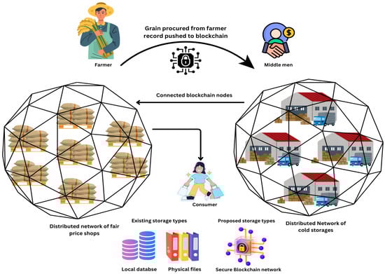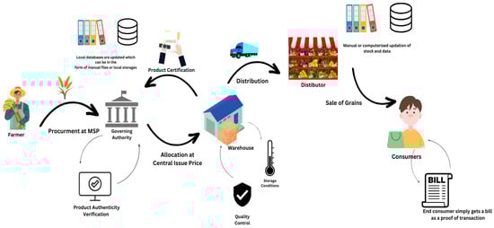 The existing grain supply chain in agriculture relies on minimal technology and predominantly manual record-keeping, making it susceptible to malpractices such as misrepresentation of product availability and black marketing of crucial and high-demand grains. This lack of transparency and traceability hinders the efficiency and integrity of the supply chain, ultimately impacting farmers, consumers, and the overall economy, as depicted in Figure 1. This situation allows for corruption in government-controlled product pricing, sales, and purchases due to the lack of transparency and efficient record-keeping [4,5]. In India, corruption at Food Corporation of India (FCI) warehouses is frequently reported. Officials often input incorrect information into government databases. For example, if a farmer purchases 150 kg of grain, FCI officials might record it as 225 kg sold. The remaining 75 kg is then back-channelled and sold later at inflated prices, creating an expensive market [6]. This corruption increases costs and makes it difficult for poor farmers to access good-quality grain, posing a significant issue at the initial stages of the food supply chain.