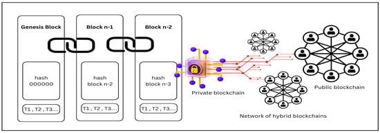 Traditional systems are primarily based on the client–server architecture and centralized database. Blockchain is a decentralised ledger with a peer-to-peer system of networks. It is a cryptographically secure, immutable, append-only ledger, which can replace the current system [13,14]. Blockchain comprises blocks that are append-only, and a particular block may store data such as a list of transactions, as depicted in Figure 2. Next, a block is attached to the pertaining block, forming a chain, giving it the name blockchain. Each block except the first block, called the genesis block, stores a hash of the previous and next block, which is a cryptographic code. The hash must match in order to form a link between blocks. If anything in the block is changed, the hash is updated to a new value, thus breaking the link and the chain. The blockchain is a decentralized network and works on a mutual consensus paradigm to make any change. The consensus algorithms verify and authenticate the transactions so the public ledgers remain in harmony and ensure only valid transactions are further added to the blockchain. Proof of work [15,16] is the most widespread consensus algorithm today, which requires the exertion of the computational power of a node to solve an arbitrary puzzle to validate transactions.