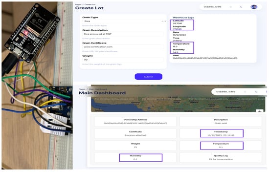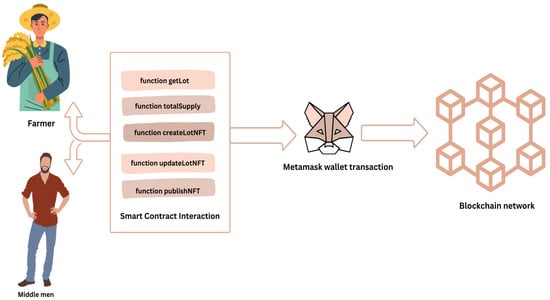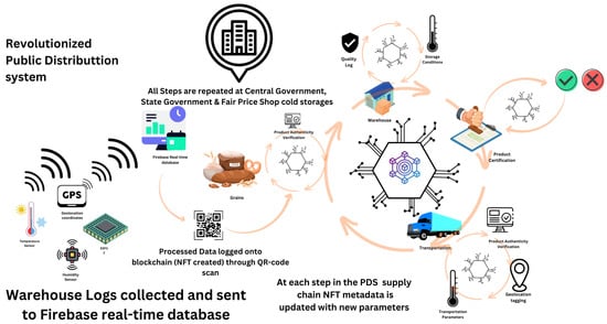 The proposed framework integrates various steps, utilizing blockchain technology, Firebase, and additional components to establish transparency and traceability within the public distribution system for grains [19,20,21]. The framework involves the collection of real-time sensor data, including temperature, humidity, and geolocation coordinates, which are stored in the Firebase real-time database for immediate accessibility. The Firebase integration acts as a dynamic link between sensor inputs and the web application, ensuring instantaneous reflection of any changes. The blockchain interaction encompasses the creation of non-fungible tokens (NFTs) for grain lots and updating and transferring ownership through transactions on the Sepolia blockchain. IPFS integration further contributes to the decentralized and tamper-resistant storage of NFT metadata. The web application serves as the user interface, featuring a dashboard with a QR code scanner, status log, location map, and quality log for stakeholders to retrieve detailed information about grain lots and enhance traceability. Quality verification involves a check on the grain’s temperature against defined thresholds, with results displayed in the quality log. User interaction is facilitated through MetaMask integration, offering features like the connect button, notification icon, dark mode, and profile icon for a seamless and secure experience. Continuous monitoring ensures system health, detects anomalies, and plans regular updates based on user feedback, technological advancements, and industry standards. The procedural workflow, depicted in Figure 4, underscores the seamless integration of sensor data, blockchain technology, IPFS, and Firebase, contributing to the proposed scheme’s overarching goals of improving traceability [22], accountability, and real-time monitoring in the grain supply chain.