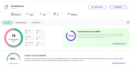 SolidityScan is employed to ensure the security and reliability of the ‘GrainChain’ smart contract, which is a cloud-based smart contract vulnerability scanner [23]. SolidityScan is designed to uncover potential vulnerabilities and anti-patterns in smart contract code. It integrates seamlessly into the development pipeline, scanning the contract’s code and flagging known vulnerabilities. SolidityScan generates a detailed audit report that highlights which parts of the code might pose security risks. The process of SolidityScan is defined below: