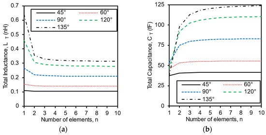 Using (3)–(4), we plot Figure 2, which shows the total inductance, , and the total capacitance, , respectively, versus the number of sections () for a different , where , , and . These calculations are done using Keysight Advanced Design System (ADS) version 2023 update 1. As can be interpreted from Figure 2a, for all the values, decreases as increases, which allows for the miniaturization of the cascaded T-network TL. Alternatively, as can be interpreted from Figure 2b, for 60°, increases as increases. Still, a large-valued capacitance with a high factor can be easily implemented with a compact size when compared to the inductance implementation. Therefore, we can accept that increased margin in the capacitance.