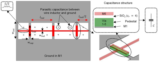 The unit inductance, , of the proposed TL is implemented using a straight wire inductance model [22], with a length of and width of . We made a cut in the ground plane of a width of below each straight wire inductance to maximize inductance per unit length. In addition, we selected the lowest metal layer, M1, for implementing the ground to minimize the parasitic capacitance between the ground plane and the wire inductance. In overall, increasing the inductance per unit length leads to a shorter , i.e., high level of miniaturization.