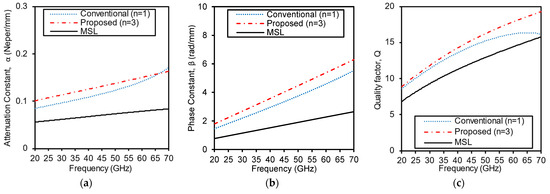 Furthermore, we compare , , and the factor of two of these designs (n = 1 “conventional” and 3 “proposed”) with the reference MSL across a wide range frequency in Figure 4a–c, respectively. These designs and the reference MSL have different and . But the proposed design (n = 3) has the best factor at 60 GHz. This factor is higher than both the reference MSL and the conventional design (n = 1). Hence, the proposed realization of the cascaded T-network TL further improves the miniaturization level and the factor when compared to conventional lumped element design.