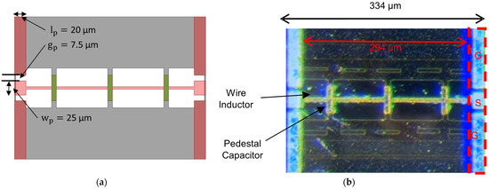Figure 6b shows the fabricated chip photograph. The pad length, width, and gap are denoted , , and , respectively. The pad dimensions selected for a 50 Ω operation, and their values are as shown in Figure 6a. The measured and simulated , , and factor have good agreements as shown in Figure 7a–c, respectively, which confirms the operation of the fabricated TL. This TL length is 294 μm (334 μm including pads). It should be noted that the shown measured results are the averaged results of 40 chips.
