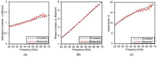 Comparison between measured and EM simulated TL characterized performance. (a) Attenuation Constant. (b) Phase Shift Constant. (c) Quality factor.