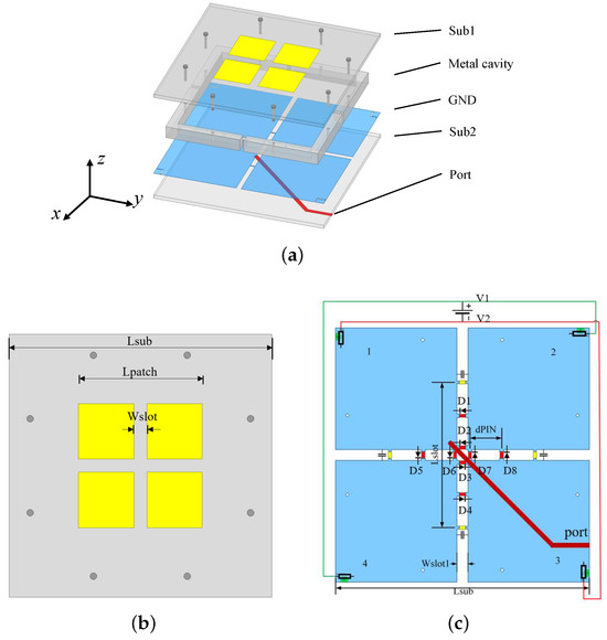 The orthogonal feed slots divide the ground into four parts. Due to the cracked metal cavity, separate voltages can be loaded into the four parts. Two PIN diodes are placed in each slot between two close parts. The arrangement of the PIN diodes (D1–D8), capacitors, and resistors is shown in Figure 1c. The geometrical dimensions of the overall antenna structure and surface mount device (SMD) component values were optimized using the HFSS simulator. The final design values are included in Table 1.