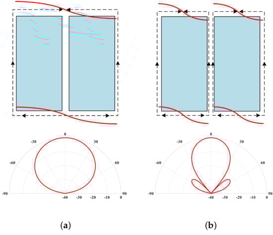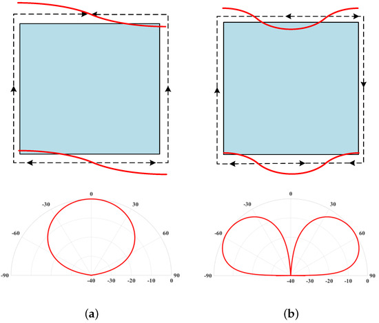 where k is the propagation constant in free space, H is the spacing between the magnetic current source and the ground (to simplify the arithmetic, we take = 1) and is the deflection angle from the positive z-axis. Then, the radiation patterns of the rectangular patches under ideal conditions can be calculate by introducing the array factor. Figure 2a,b shows the calculation results for a rectangular patch working in the traditional mode and mode obtained from Equations (2) and (3).