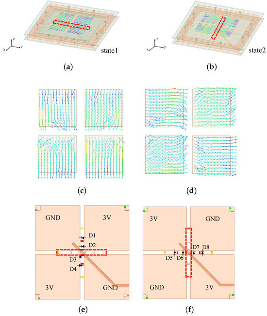 The current distribution of the antenna’s radiating patch and the on/off states of the PIN diodes on the antenna ground for both polarization states are shown in Figure 4. For state 1, as shown in Figure 4e, diodes D1–D4 are on and diodes D5–D8 are off at this voltage, which is equivalent to etching a slot (framed by the red dashed line) along the Y-axis direction in the center of the ground. As a result, the antenna is fed through the aperture coupling, which excites a current distributed along the X-axis direction on the radiating patch, achieving X-axis direction line polarization, as seen in Figure 4c. Correspondingly, for state 2, diodes D5–D8 are on and diodes D1–D4 are off at this voltage, which is equivalent to etching a slot along the X-axis direction in the center of the ground; due to the symmetry of the antenna structure, linear polarization is achieved in the Y-axis direction, as seen in Figure 4d,f.