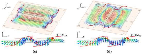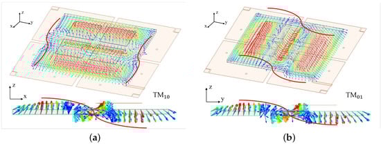 Due to the magnitude of the electric field being 0 at the center, the gap barely affects operation in mode. However, the gap is located at the electric field’s maximum in mode, which breaks the continuity of the electric field distribution in this mode. Due to the presence of strong coupling currents on the gap, the direction of the electric field on both sides of the gap is abruptly changed. The gap also flips the direction of the equivalent magnetic current on both sides of the patch. In Figure 4, the transformed mode (T- mode) produces four equivalent magnetic currents in the same direction, creating a stable broadside pattern which can be calculated using Equation (4).