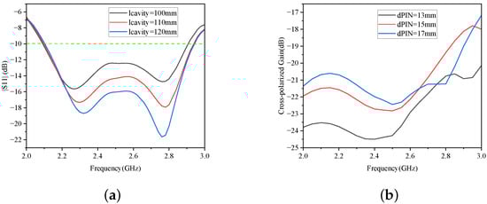 Parametric analysis: (a) frequency response of |S11| as a function of the side length of the metal cavity and (b) frequency response of the antenna’s cross-polarization gain with dPIN at 2.4 GHz.