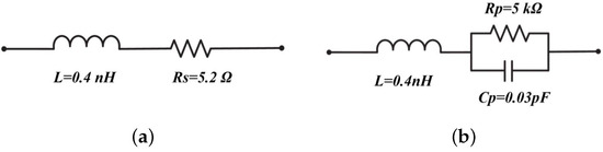 Modeling and investigation of the proposed antenna were carried out in the HFSS simulator, a full-wave electromagnetic (EM) simulation software. In the simulations, the ON–OFF state of the PIN diodes (MADP-000907-14020) were modeled according to the equivalent circuit model (see Figure 7) provided by the datasheet.